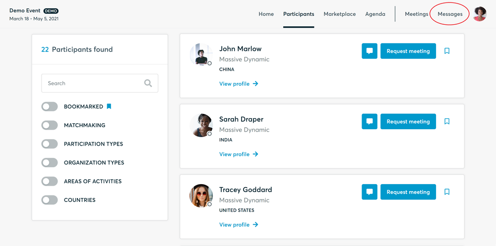 - Identify promising participants on the Participants list or the Marketplace page on the event's website. Once you found a suitable meeting partner, click "Request meeting" to send them a meeting request.